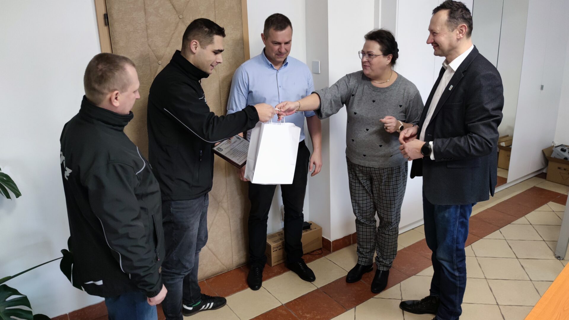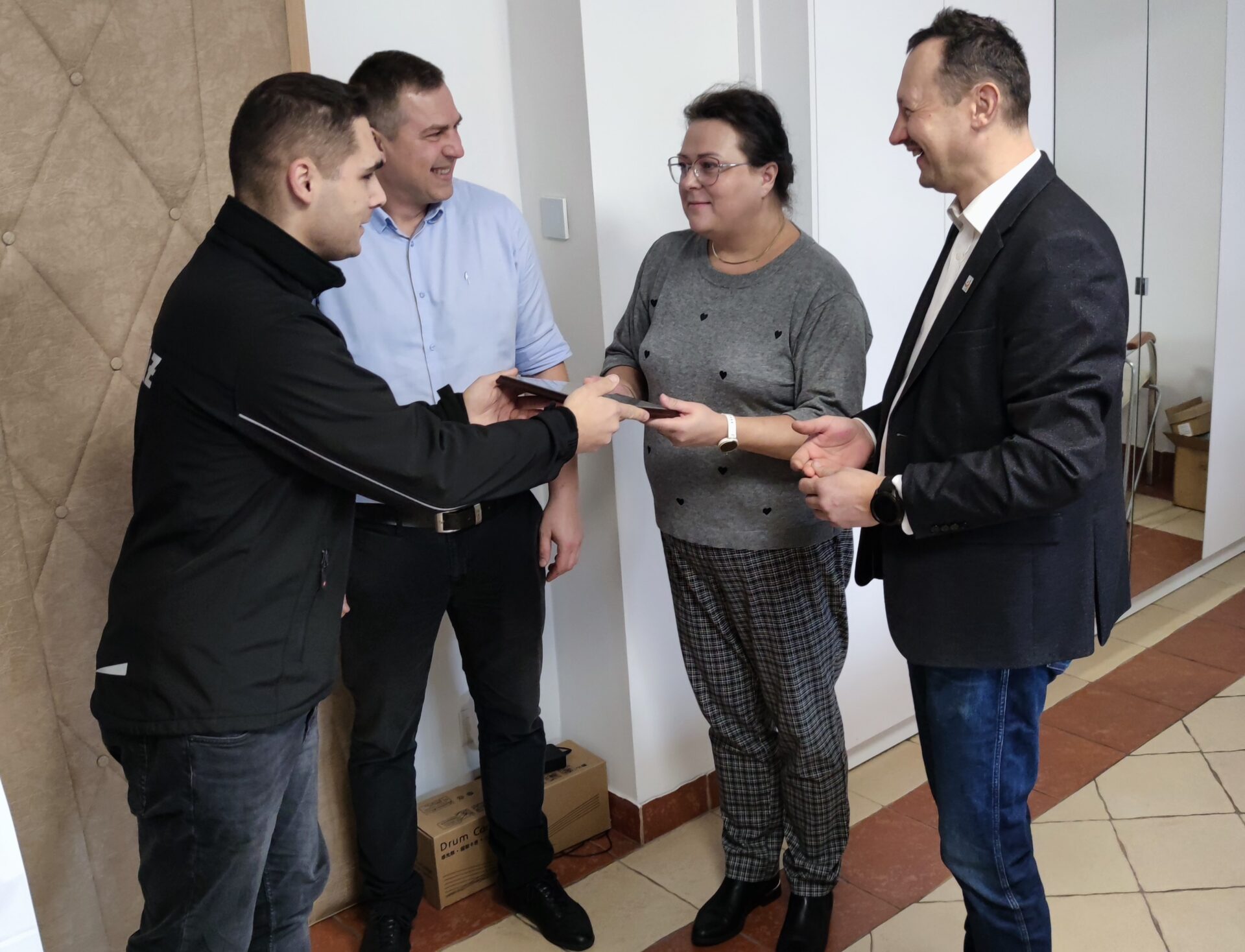 Prezes Pawel Pieta, główna księgowa Marta Tylkowska oraz pełnomocnik zarządu Łukasz Kowalik przekazali druhom z Łowicza (Adamowi Świątkowskiemu oraz Dariuszowi Żelaźkiewiczowi) tablet ufundowany przez ŁSM.
